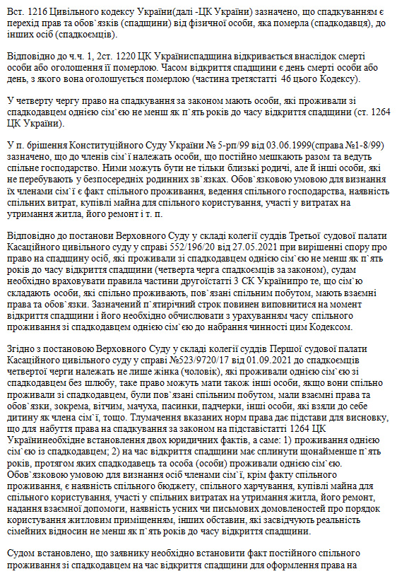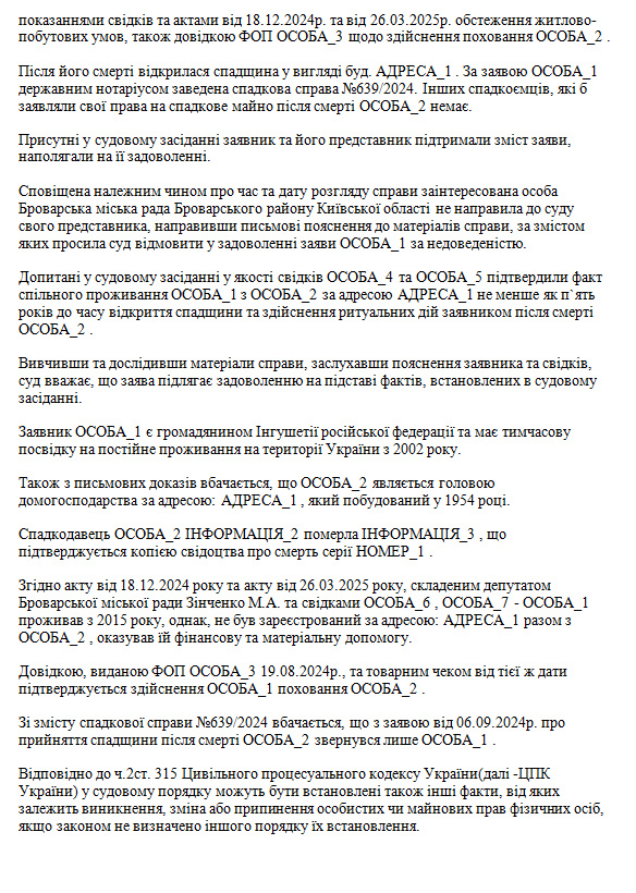В провадженні Броварського міськрайонного суду Київської області знаходилась вищевказана цивільна справа. В обґрунтування заяви, представником заявника адвокатом Філіповою О.В., яка діє у інтересах ОСОБА_1 , зазначено, що останній з 2015 року проживав однією сім`єю з ОСОБА_2 , яка померла ІНФОРМАЦІЯ_1 , за адресою: АДРЕСА_1 . При цьому, вони вели спільне господарство, мали спільний бюджет та, фактично, виконували права і обов`язки подружжя. Вказані обставини підтверджуються показаннями свідків та актами від 18.12.2024р. та від 26.03.2025р. обстеження житлово-побутових умов, також довідкою ФОП ОСОБА_3 щодо здійснення поховання ОСОБА_2 .