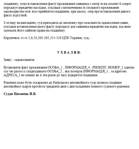 Встановити факт проживання ОСОБА_1 , ІНФОРМАЦІЯ_4 , РНОКПП: НОМЕР_2 однією сім`єю разом із спадкодавцем ОСОБА_2 , яка померла ІНФОРМАЦІЯ_1 , за адресою: АДРЕСА_1 не менше як п`ять років до часу відкриття спадщини.